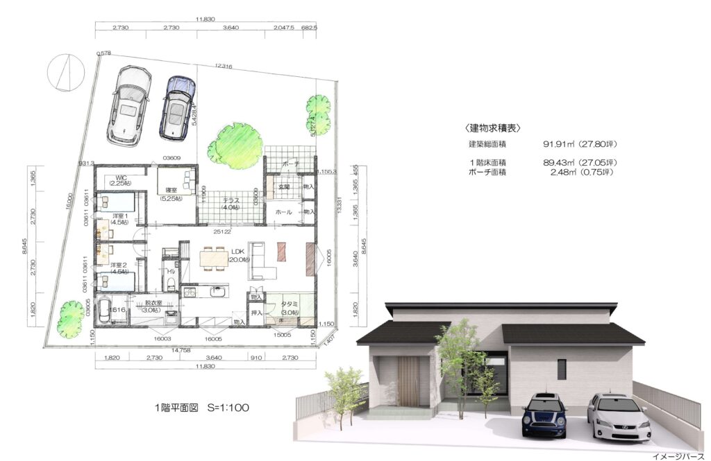 建物概要:平屋建て3LDK / 建物27.80坪(91.91㎡) / 敷地面積65.29㎡(215.86㎡) / UA値0.54